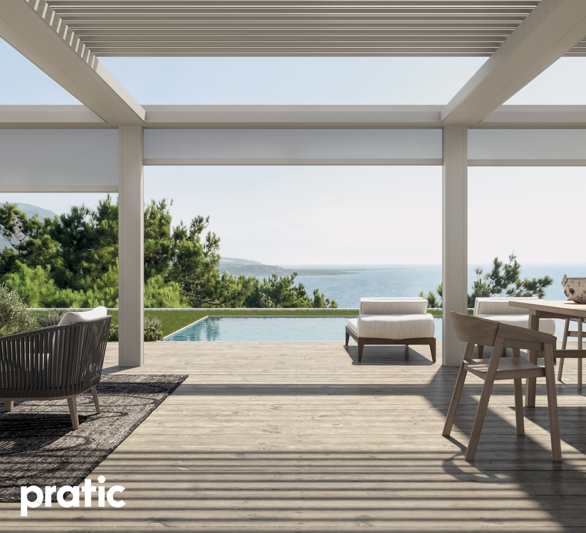 Le pergole frangisole si caratterizzano per le lamelle in alluminio che rifrangono la luce del sole e possono essere orientate mediante un comodo telecomando. Le pergole Pratic sono particolarmente versatili e possono essere usate tutto l'anno, in quanto sono integrabili con chiusure verticali e riparano dagli agenti atmosferici.